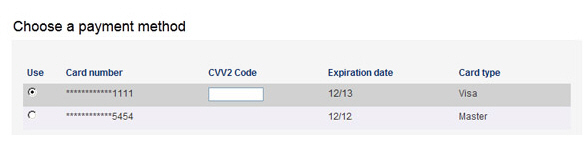 The Choose a payment method section will display the saved credit cards for the active customer.