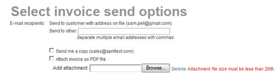 Checking the Attach invoice as a PDF file box will instruct the system to attach a .pdf version of the invoice to the email sent to your customer. This will enable the customer to view and save the invoice directly from the email, even if they are not connected to the Internet.