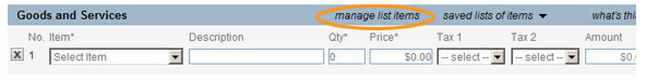 When you click the “manage list items” link, the List Item Management screen opens, and you will lose any data you have entered on the send new invoice screen. To avoid losing data, be certain to use this link only from a blank invoice. |