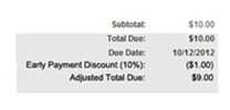 Early Payment Incentive: This box will appear on the invoice if an incentive for early payment is active. Once the incentive expires, the box will be replaced by a text line describing the discount that could have been received had the invoice been paid early. The notice will indicate the number of days prior to the due date the invoice must be paid in order to get the discount. The discount will be either a fixed dollar amount or a percentage of the invoice total.